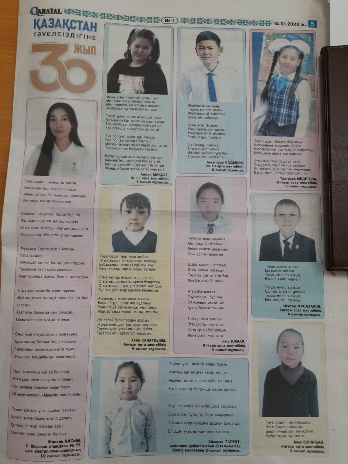 "ҚР тәуелсіздігінің 30 жылдығына" орай аудандық "Қаратал" газетінде жарияланған балалар шығармашылығы. Жас ақын, мектеп Презиендті Қасым Жанель "Тәуелсіздік тұғырым" өлеңін арнайды.